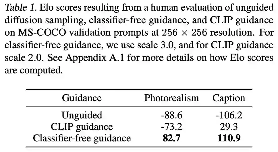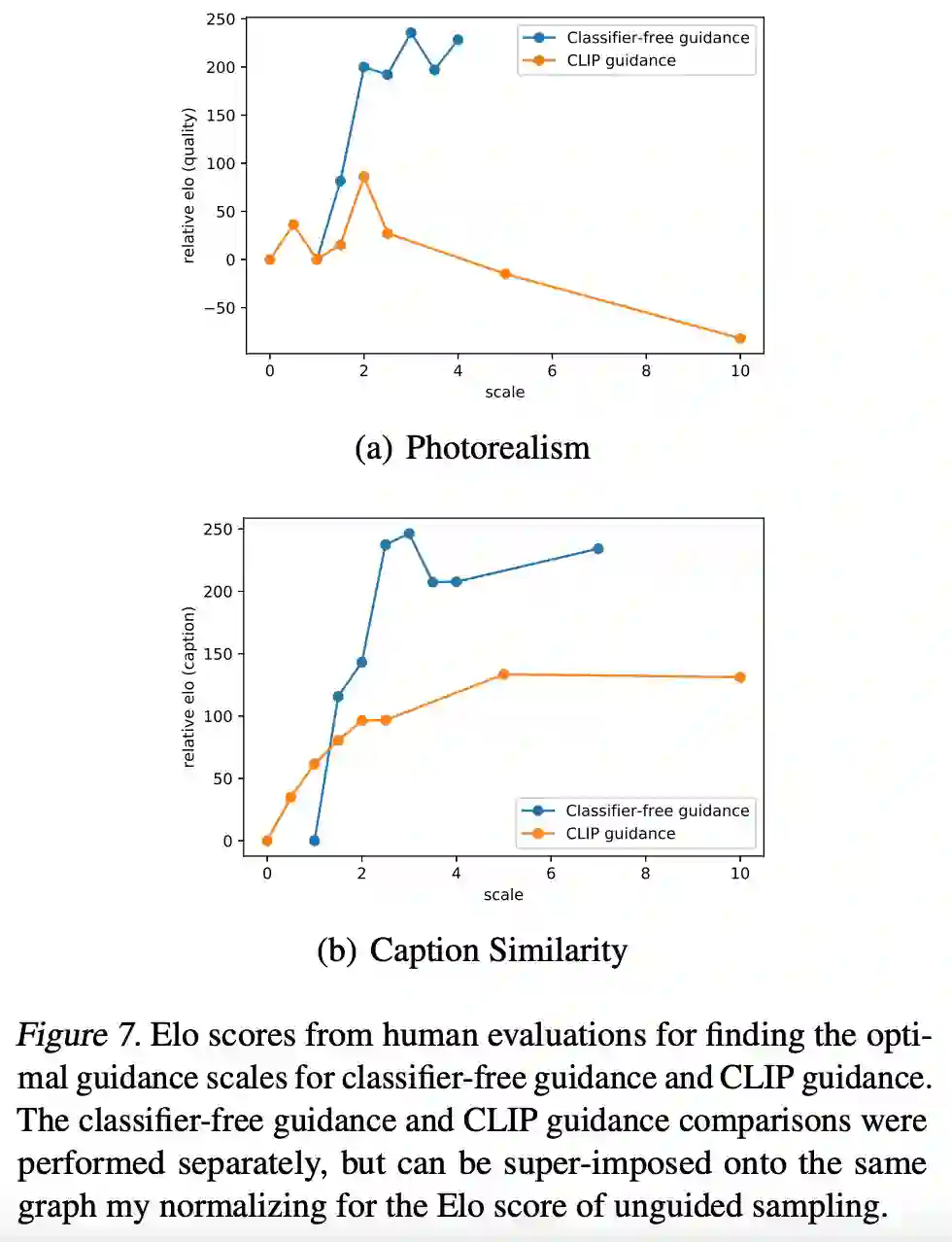 并将人类评估的结果和下表 1 的结果进行比较,然后该研究发现人类和 CLIP 指导给出的分数不一致,因此无分类器指导能够产生与人类认知一致的更高质量生成结果。