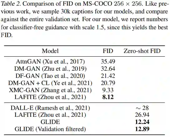 此外,研究者还将 GLIDE 与其他文本生成图像模型进行了比较,结果如下表 2 所示。GLIDE 在 MS-COCO 上获得有竞争力的 FID。