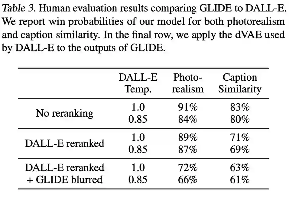 最后,该研究使用上述人类评估实验设置比较了 GLIDE 和 DALL-E ,结果如下表 3 所示。注意到 GLIDE 的训练使用与 DALL-E 大致相同的训练计算,但模型要小得多(35 亿参数 VS120 亿参数),所需采样延迟更少,并且不需要 CLIP 重排序。