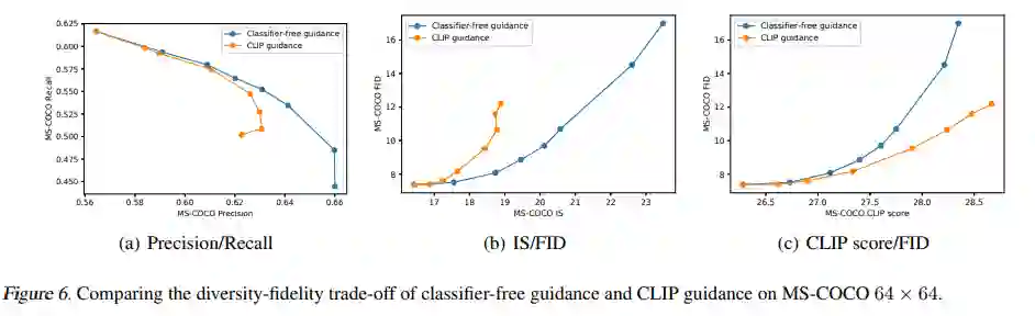 该研究首先通过查看图像质量保真度权衡的帕累托前沿来评估无分类器指导和 CLIP 指导之间的差异。下图 6 在 64 × 64 分辨率下评估了这两种方法的零样本 MS-COCO 生成。