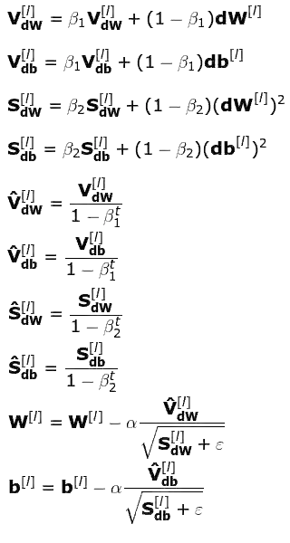 不幸的是,随着优化方法有效性的提高,计算复杂度也会增加。上面列了 10 个描述优化过程单次迭代的矩阵公式。我知道那些数学基础薄弱的读者情绪肯定不高。但是不要担心,它们并不是什么新内容。这里的公式和前文给出的动量梯度下降和 RMSProp 一样。不过这里我们需要一次性运用这两个策略的思路。