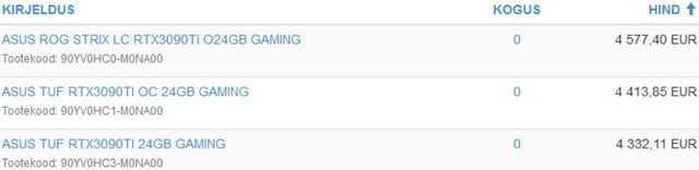 数码博主 @momomo_us 今日在国外社交平台上爆料,零售商泄露的清单显示三款华硕 ROG 和 TUF RTX 3090 Ti 价格非常夸张,将超过 4332 欧元(约合 31536 元人民币)或更高。从曝光的内容来看,这款华硕 TUF RTX 3090 Ti 是爱沙尼亚零售商出售的 3090Ti 中最便宜的,起步价为 4332.11 欧元(约合 31537 元人民币),OC 超频版为 4413.85 欧元(约合 32132 元人民币),而顶级的液冷旗舰版 ROG Strix RTX 3090 Ti 为 4577.40 欧元(约合 33323.47 元人民币)。