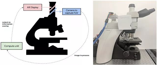 左图:增强现实显微镜的原理概述。一台数码相机捕捉到与用户相同的视场(FoV),然后将图像传送给一个附加的计算单元,该单元能够运行实时推理的机器学习模型。随后推理结果被反馈到一个定制的AR显示屏,该显示屏与目镜内联,并将模型输出的结果与标本显示在同一平面上。右图:该图展示了我们的平台原型被改造成典型临床级光学显微镜后的样子。