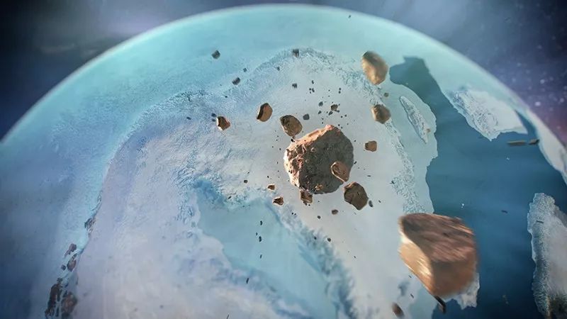 小行星像一连串原子弹猛烈撞击格陵兰岛西北部,立即将岩石蒸发并且向整个北极发送冲击波。