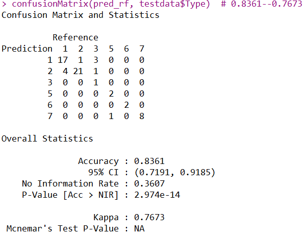 confusionMatrix(pred_rf, testdata$Type) # 0.8361--0.7673