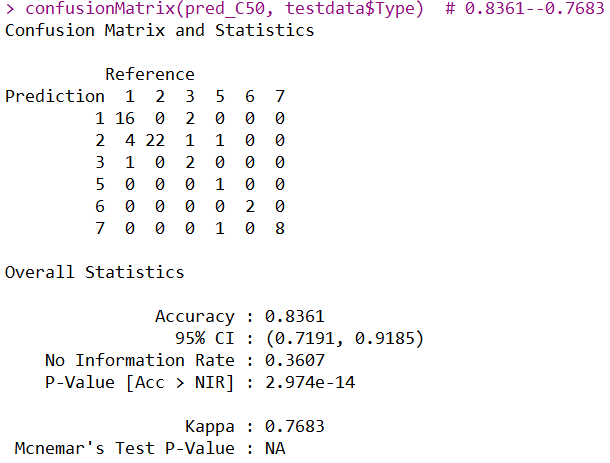confusionMatrix(pred_C50, testdata$Type) # 0.8361--0.7683