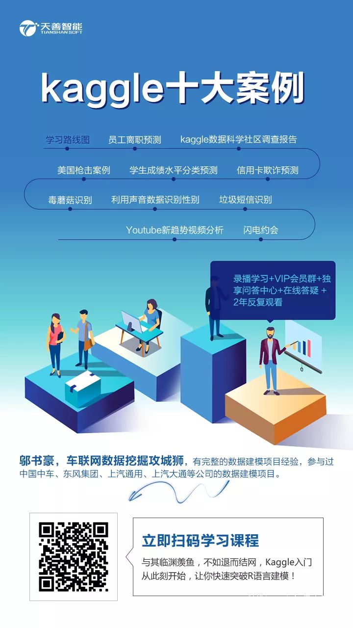 注:本案例不提供数据集,如果要学习完整案例,点击文章底部阅读原文或者扫描课程二维码,购买包含数据集+代码+PPT的《kaggle十大案例精讲课程》,购买学员会赠送文章的数据集。