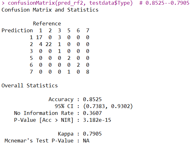 confusionMatrix(pred_rf2, testdata$Type) # 0.8525--0.7905