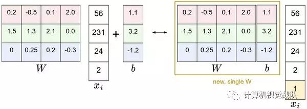 还是以CIFAR-10为例,那么的大小就变成[3073x1],而不是[3072x1]了,多出了包含常量1的1个维度)。W大小就是[10x3073]了。中多出来的这一列对应的就是偏差值b,具体见下图: