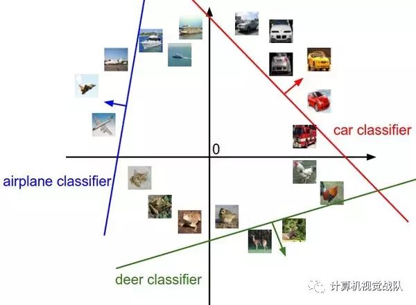 图像空间的示意图。其中每个图像是一个点,有3个分类器。以红色的汽车分类器为例,红线表示空间中汽车分类分数为0的点的集合,红色的箭头表示分值上升的方向。所有红线右边的点的分数值均为正,且线性升高。红线左边的点分值为负,且线性降低。