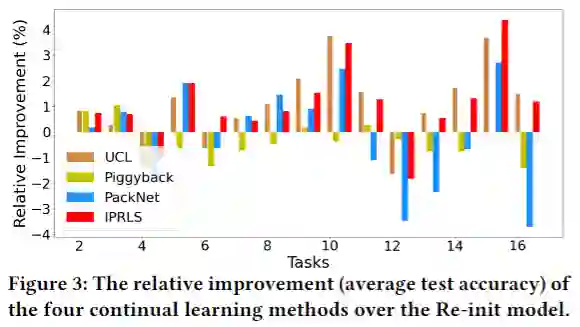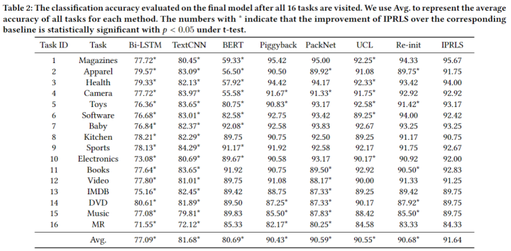 为分析 IPRLS 利用旧任务知识提高新任务性能的能力(正向迁移),论文中还报告了 BERT 模型在每一个任务被训练后重新初始化(为每个任务学习一个单独的模型)设置下的性能(记为 Re-init)。