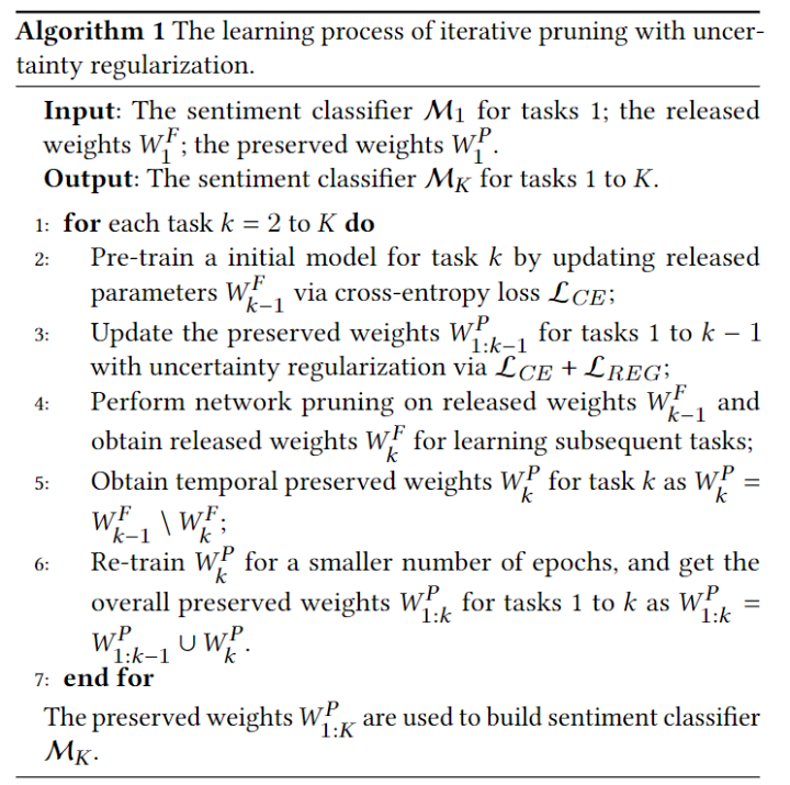 论文工作遵循持续学习的场景。情感分类器对一系列无限的任务进行学习。论文使用一个迭代的、三阶段的框架来进行终身情感分类。首先,通过对 BERT 模型的所有保留权重应用不确定性正则化来训练新任务的初始网络。第二,采用基于权重的剪枝技术用将 BERT 模型中相对不重要的参数进行释放,以使准确度下降最小。第三,在剪枝后重新训练网络,以恢复当前任务的准确度。接下来,我们将详细介绍这三个模块。