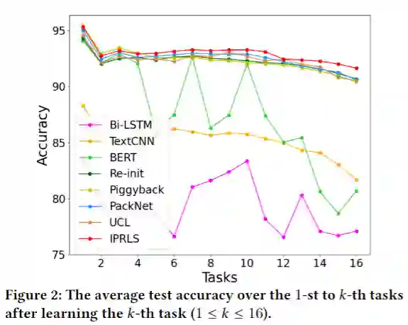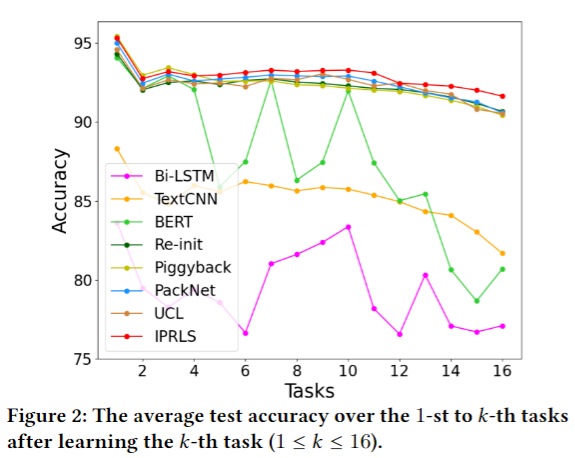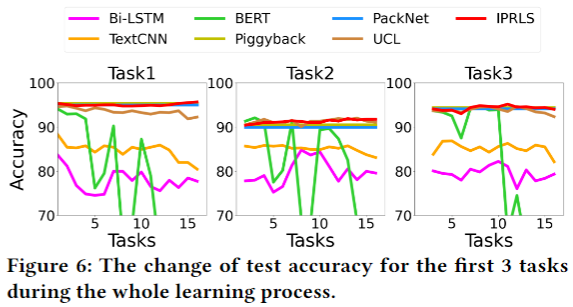 从表中可以看出,传统的深度学习模型(Bi-LSTM,TextCNN,BERT)表现远逊于持续学习方法(PackNet, Piggyback,UCL,IPRLS)。比如 BERT 在最后几个任务上表现与持续学习方法相近,但在最早的几个任务上则表现很差,这是由于传统的深度模型并没有刻意保存旧任务知识,因此会不可避免地遭受灾难性遗忘。