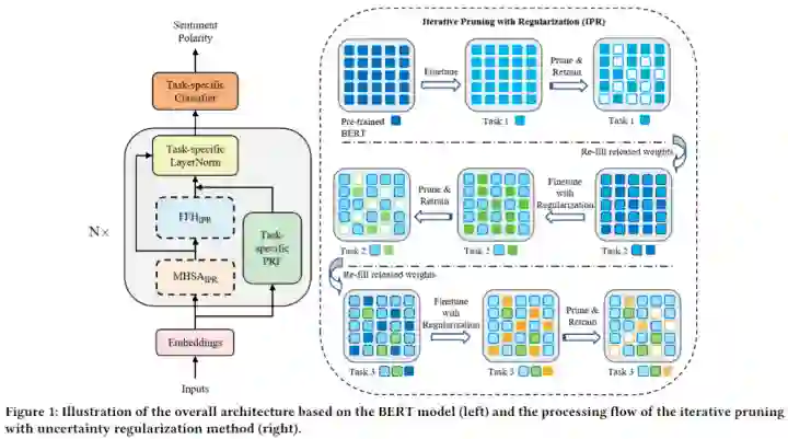IPRLS 论文提出了一种基于不确定性正则化与迭代网络剪枝的终身情感分类方法。其采用 BERT 作为情感分类的基础模型,为解决稳定性可塑性难题,IPRLS充分利用了网络剪枝和权重正则化技术,将多个顺序到来的任务中的重要知识依次集成到单个 BERT 模型中,同时尽可能地避免模型准确度降低。