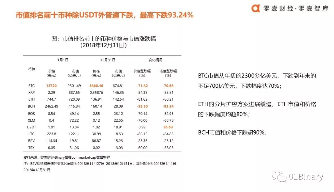 对此,零壹财经·Binary联合数字资产研究院发布的《区块链产业发展报告(2018)》给出了答案。报告从行情、技术、投资和监管等角度全面回顾了区块链2018年的发展状况。报告认为,2018年是区块链的转折之年,行业共识近乎崩塌,而前十大币种中唯有USDT市值上涨更是对整个加密货币行业的讽刺。但隔离见证、闪电网络等区块链技术的持续发展,以及各类大型企业/机构的入场,也让所有人看到了区块链未来发展的希望。