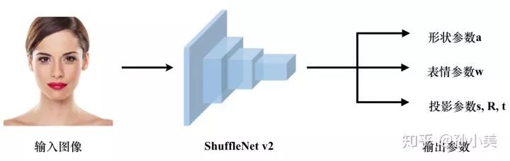 为了令上述方法能在手机端实时运行,旷视研究院采用了神经网络端到端学习,如下图所示。神经网络具备强大的学习能力,省略了凸优化算法中繁琐费时的迭代过程,端到端的直接学会了如何从一张人脸直接预测出其所需要的调制参数。