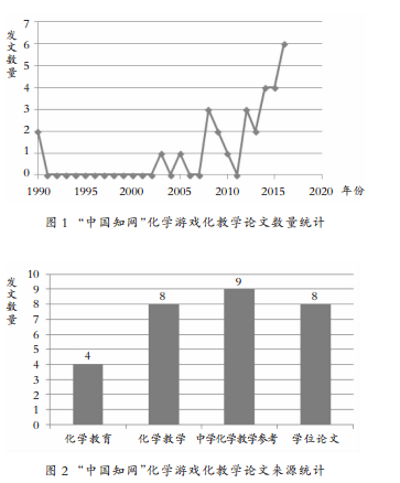 我们在“中国知网“以“化学”并“游戏”为主题进对行检索,学科选择“中等教育”,主要对《化学教育》《化学教学》《中学化学教学参考》三大化学教育类期讲刊及硕博士论文进行分析,侧重关注游戏在学校化应学课堂教学中的应用。根据内容的相关性,我们选取相关文献29篇,如图1、图2所示。