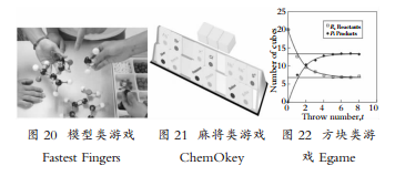 除此之外,根据游戏教具类型,还有模型类、麻将类等、方块类等。譬如,模型类游戏Fastest Fingers[85](见图20),用于巩固有机化学相关知识,包括命名法、异构、基本反应等。该游戏属于团队竞赛类,在教学中,3-4名学生为一个小组,教练可在投影屏上提示某一有机物的线索,小组要又快又准地组装分子,通过使用建模工具的方式构建答案,要求速度与准确度结合,鼓励团队有效协作提高工作效率。麻将类游戏ChemOkey[86](见图21),由一套106个塑料或木制砖块组成。砖块上写有常见阳离子及阴离子的名称和符号,基本规则与麻将类似,融合公式和离子化合物创建,从而帮助学生可以学习常见离子符号和名称,了解电中性原理。而方块类游戏Egame[87](见图22),旨在让学生动手体验化学动力学原理。参与游戏的每组中有一个成员配有20块方糖方糖一面写了红色的X,一面写了蓝色的Y,这些成员为反应物R的托管者。没有被给予方糖的是产物P的托管者。第一次,搅拌R系列物质,显示出红色或蓝色标记物则归到P系列;搅拌P系列物质,显示蓝色标记则归到R系列。每次搅拌,游戏重复10次。记录每次转换的数目,以此让学生体会反应速率及化学平衡等知识,与前文提到的国内模拟化学反应的纸牌类游戏异曲同工。