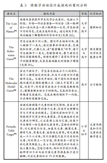 该研究按内容将化学类游戏分为化学介绍类、有机化学类、其他化学游戏。其中化学介绍类可再细分为:基本知识,元素和原子结构,术语、公式、化学方程式书写,化学反应,溶解和溶解性,其他物质。根据游戏元素的使用方式,在教学活动中同样可分为使用游戏、将教学活动设计成游戏两种形式。在游戏中电子游戏、卡片游戏、桌面游戏三者占主导地位。国外与国内的游戏化教学有很多相似之处,但国外的游戏更加多样,且注重引导学生认识微观世界。如,1929年有研究者在课堂上让学生用带钩的原子建构分子模型,直观认识物质的元素构成;1976年有研究者设置了一个游戏,让学生挑选聚苯乙烯小企球做的原子,通过给定的原子大小和价电子数来界定原子,在给定时间内瓶装尽可能多的分子。