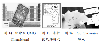 此类卡片游戏类型较多,包括ChemMend[76](见图14)、The Old Prof Card Gamen[77](见图15)、Go Chem-istry[78](见图16),Cheminoes [79]、Families of Chemical Elements Game[80]。部分改编自在日常生活中为大家所喜闻乐见的纸牌游戏,如,“UNO”、“老女仆”、“去钓鱼”等,可供多位学生一起进行游戏,在出牌中熟悉相关知识,训练思维能力。如,“ChemMend”改编自“UNO”,用于巩固元素周期表知识,90张卡片含有元素周期表中的典型元素信息,另外27张卡片无化学信息,打牌规则包括同主族、同周期出牌、无化学意义的功能牌出牌,每局5-15分钟。而“老教授”纸牌游戏,则是“老女仆”和“去钓鱼”游戏交叉改编而成。