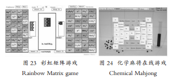 再者,如Rainbow Matrix game[94](彩虹矩阵游戏,见图23)可用于帮助学生学习,游戏设定了不同的阳离子和阴离子各36种,学生要将两者正确组合,并输入所组成的化合物的化学式及名称。计算机会根据学生完成情况评价等级并反馈给老师。