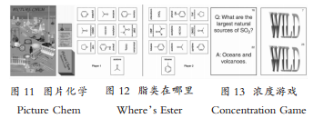 譬如,用于化学实验仪器教学的Picture Chem(图片化学)烟(见图11)。该游戏由30张任务卡和一个游戏板组成,任务卡由教师和学生自制,包含实验童常见化学仪器的定义和功能,游戏版上有每种化学仪器的图片;游戏任务为小组比赛,按任务卡上信息寻找相应化学仪器。还有同样用于实验仪器教学的卡片类游戏The Match Game(匹配游戏)[69]。在游戏准备阶段,学生将课程涉及到的仪器分别写在40到50张卡片上:在游戏配对环节,学生分组合作,按照索引表找出对应卡片,教师检查并讨论用途;在游戏讨论环节,以学生为主,对实验设备进行比较,包括其优缺点、使用条件等。Elements(元素)[70]则用于化学元素名称和符号的教学,亮点包括由学生自行设计的卡片。