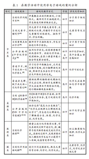 通过对论文进行内容分析,我们同样可以将国内化学游戏化教学分为两种形式进行讨论:其一在教学活动中使用游戏,包括非电子类游戏及电子类游戏;其二将教学活动设计成一个个游戏。