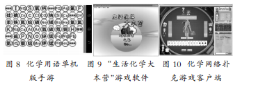 电子游戏与化学教学结合存在以下三大特点。其一,部分游戏由日常生活中风靡的电子游戏演化而来,容易激发学生兴趣。如,“化学用语单机版手游”(见图8)灵感来源于“连连看”、“消灭星星”这两款游戏[46]。其二,游戏形式以角色扮演类居多[47-48],而这也正是青少年比较喜欢的游戏类型之一。学生被赋予不同的角色,如,“热爱化学的青年学生”(见图9)、“岛屿的开发”和“攻克者”、“化学战士”“黄金矿工”等。学生在虚拟世界中主动进行探索体验,容易获得成就感和满足感。其三,游戏结合限时挑战、阅关晋级等机制,该类型的活动有利于激发学生斗志。如,“520化学网络扑克”游戏[49](见图10.www.520hx.com.cn/yx),以小组比赛的形式进行,每轮比赛三局、每局各小组第一名出线并进人下一局比赛,其余三方皆被淘汰,一轮比赛结束后奖励积分最高的小组和个人。该游戏为教室解决了化学用语教学难点问题,为中学生提供自主和合作的学习新平台,被广泛应用于中学生的化学学习、化学教育专业大学生的课程学习以及化学一线教师的进修培训中,已取得理想成效。