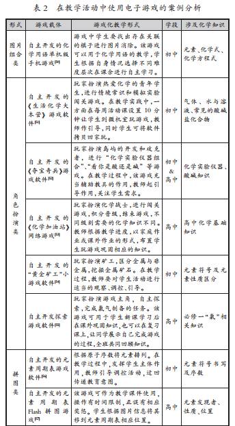 电子游戏(Digital Game)是指依托电子设备进行的一种游戏体验方式,包括游戏机游戏、电脑游戏、移动游戏(主要为手机游戏)等,是很多青少年学生重要的娱乐方式之一。电子游戏具有竞争性、互动性、即时性等特点,对学生会产生强烈的吸引力。此外,相较于非电子类游戏,电子游戏更加形象生动,有利于学生在游戏中产生沉浸感,学生置身其中学习化学知识,易于突破化学难点。随着网络、手持智能终端等的发展普及,教师逐渐在教学活动中尝试使用电子游戏,如表2所示。