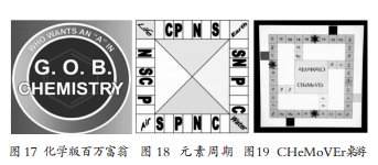 桌游类游戏规则更加丰富,且各有特色,包括G.0.BChemistry[81](见图17)、Element Cyclesl8l(见图18)、CHeMoVEr Board Game[83](见图19)、Nucleogen-esis[84]等游戏。G.0.BChemistry游戏堪称“化学版的百万富翁”,该游戏可应用于有机生物化学课程复习。在游戏准备阶段,学生自编问题,对应章节,由至少一名同学互相校对给出的答案,并从中挑选60-80个问题&答案用于游戏。比赛时部分学生作为选手,部分作为场外观众,以“百万富翁”游戏为依托,进行问答游戏。