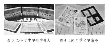 其中,华商师大钱扬义教授团队致力于化学扑克牌游戏的开发与应用,已历经14年,由本科生及硕士生共同参与研究,成果包括纸质版和网页版扑克游戏(www.520hx.com.cn/yx)。“纸质版520化学扑克牌游戏”包括不同系列[24-29],正式出版的游戏包括广州出版社出版的《忘不了中学化学扑克》,该游戏包含三盒扑克牌(一盒初中、两盒高中),一本《新课标高一化学基础知识训练》、一本《化学用语5分钟小测》(见图3);由科学出版社出版的《520中学化学桌游》,该桌游包含四副扑克牌及一本《520中学化学桌游学习法》(见图4),其参考了“UNO”、“三国杀”等,开发“开胃菜”、“翻翻乐”“争上游”、“化学桌游”四款游戏,适合初中化学不同学习阶段。“520化学纸质扑克牌”游戏充分发挥“玩化学、化学好玩、玩好化学”的教学理念,得到了中科院院士、工程院院士、化学教育家、心理学专家等多位学者的高度肯定。