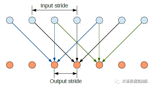 简单介绍下空洞卷积在卷积神经网络的使用(在后期分享的DeepLabv3中有更详细的讨论)。在1-D的情况下,我们扩大输入核元素之间的步长,如下图Input stride: