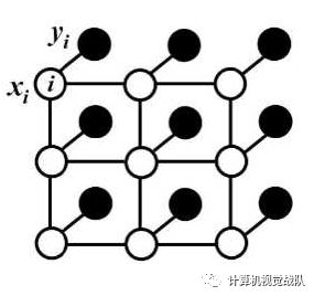 对于每个像素位置i具有隐变量xi(这里隐变量就是像素的真实类别标签,如果预测结果有21类,则(i∈1,2,..,21),还有对应的观测值yi(即像素点对应的颜色值)。以像素为节点,像素与像素间的关系作为边,构成了一个条件随机场(CRF)。通过观测变量yi来推测像素位置i对应的类别标签xi。条件随机场示意图如下: