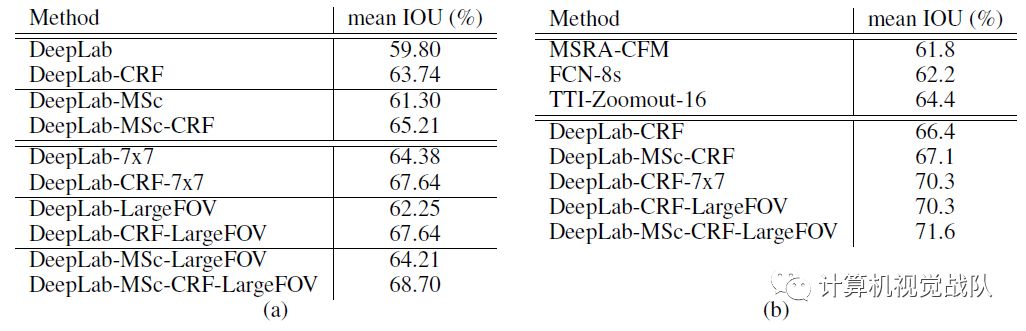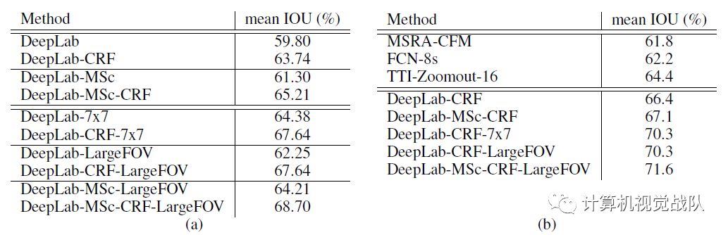 可以看到带CRF和多尺度的(MSc)的DeepLab模型效果明显上升了。