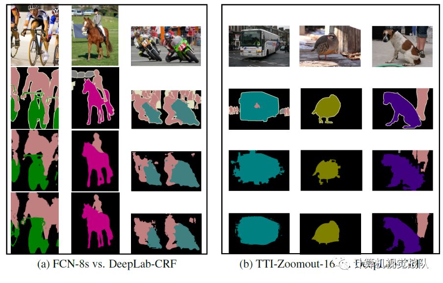 训练时将预训练的VGG16的权重做fine-tune,损失函数是输出的特征图与ground truth下采样8倍做交叉熵和;测试时取输出图双线性上采样8倍得到结果。但DCNN的预测物体的位置是粗略的,没有确切的轮廓。在卷积网络中,因为有多个池化层和下采样的重复组合层使得模型具有平移不变性,我们在其输出的high-level的基础上做定位是比较难的。这需要做分类精度和定位精度之间是有一个自然的折中。