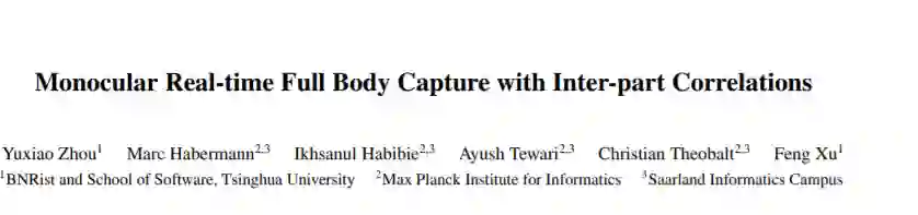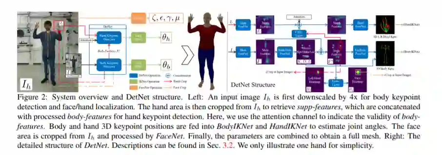 本文提出了第一种实时全身捕捉的方法,该方法通过单一颜色图像的动态3D人脸模型来估计身体和手的形状和运动。我们的方法使用了一种新的神经网络结构,利用身体和手之间的相关性在高计算效率。与以往的工作不同,我们的方法是在多个数据集上联合训练,分别关注手、身体或面部,不需要同时标注所有部分的数据,这是很难创建足够多的多样性。这种多数据集训练的可能性使其具有优越的泛化能力。与早期的单眼全身方法相比,我们的方法通过估算统计人脸模型的形状、表情、反照率和光照参数来捕捉更具表现力的3D人脸几何形状和颜色。我们的方法在公共基准上实现了具有竞争力的精度,同时显著更快,提供更完整的面部重建。