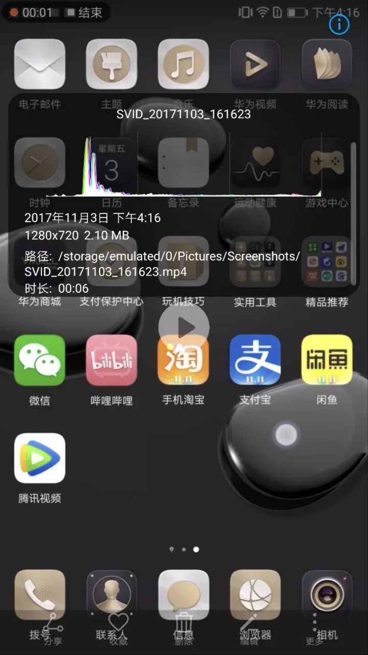 安卓 5.0 之后开放了录屏权限,手机不用 Root 也可以轻松录屏。EMUI 8.0 上的录屏功能非常简洁,首先它没有单独的 APP,也找不到设置选项。录屏的方法有两种:点击下拉通知栏中的录屏按钮或者用两根手指的关节敲击手机屏幕。录屏结束后,视频文件会保存到相册中。