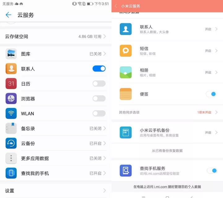 如今,云服务已经成为手机厂商的重要软实力,在信息备份方面起着无可比拟的作用,EMUI 8.0 和 MIUI 9 的云服务功能都非常强大,基本涵盖了通讯录、短信、照片、便笺、手机查找等多个功能。