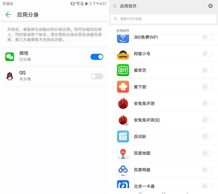 EMUI 8.0 上将这种功能成为应用分身,但只支持微信和 QQ 两个应用,MIUI 9 则几乎支持所有应用。