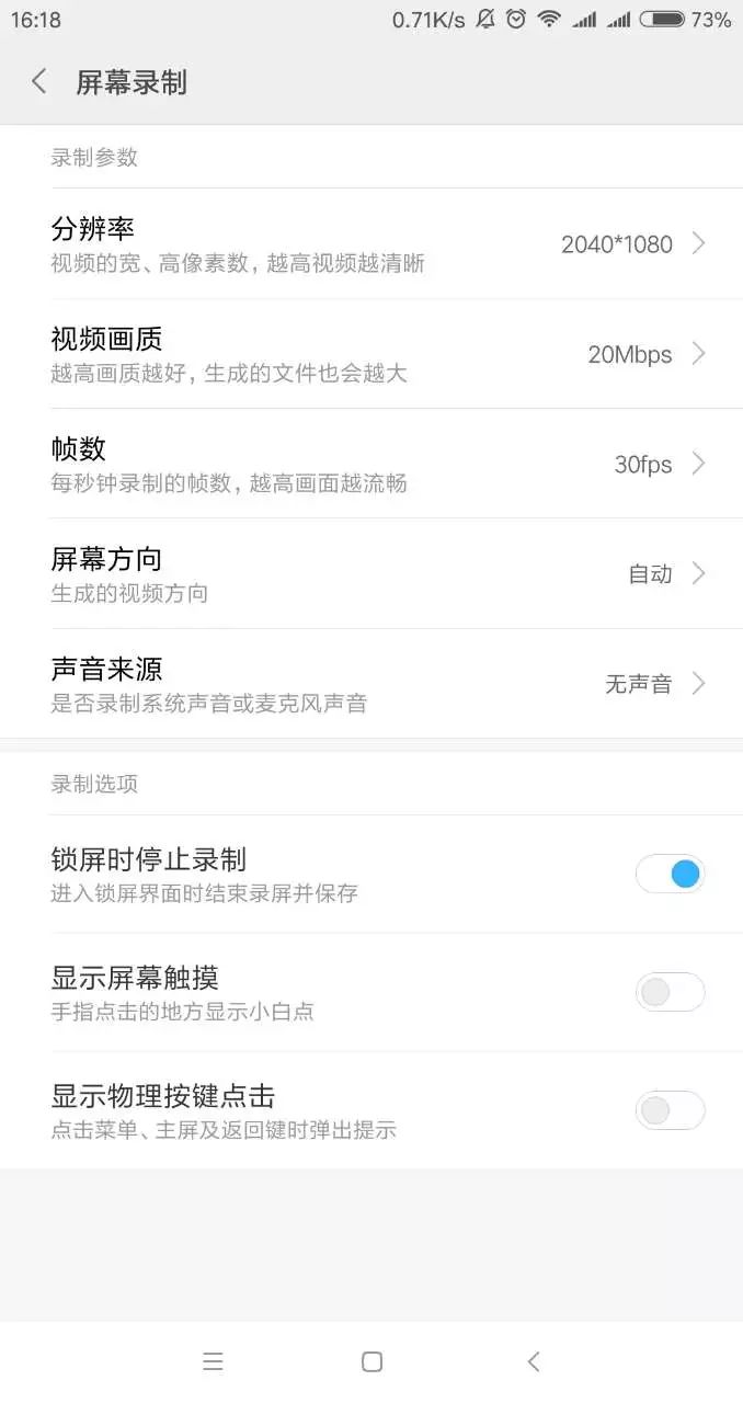 MIUI 9 中增加了一个录屏 APP,设置中可以手动调节分辨率、码率、帧数、视频方向和声音来源,功能要比 EMUI 丰富得多。