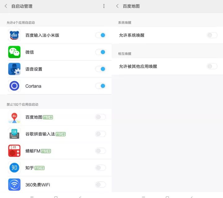 MIUI 9 则可以在安全中心中直接禁止应用自启动,同时默认禁止应用被唤醒。