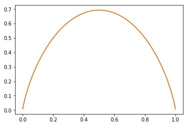 对于抛硬币判正反面来说,它的概率分布是伯努利分布,我们假设正面朝上的概率为p,则反面朝上的概率为(1-p),它的熵就是: