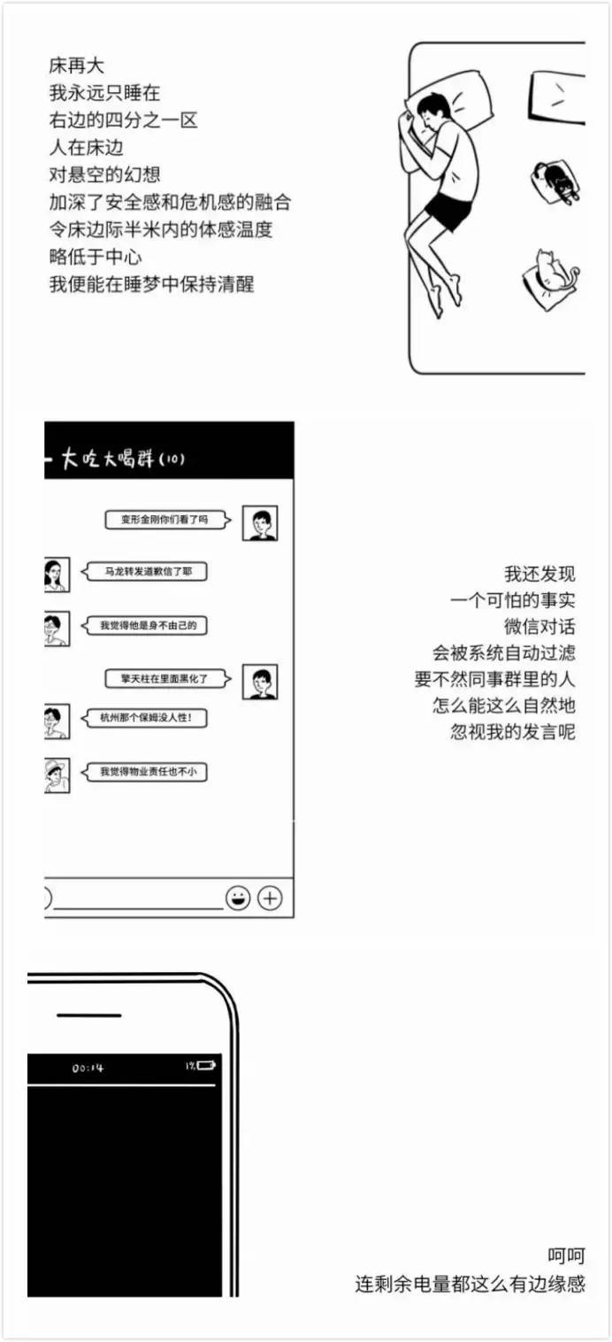 6月28日,Rocco在朋友圈分享了「GQ实验室」当天的推送《边边边...缘青年》,并留言“觉得这是GQ实验室今年做得最好的一条微信推送”。这篇推送,用极简的手绘漫画+观察入微的文案表现出大城市“边缘青年”的普通生活,然而最终的阅读量“仅有”6万。从阅读量上,显然没有达到“最好”。