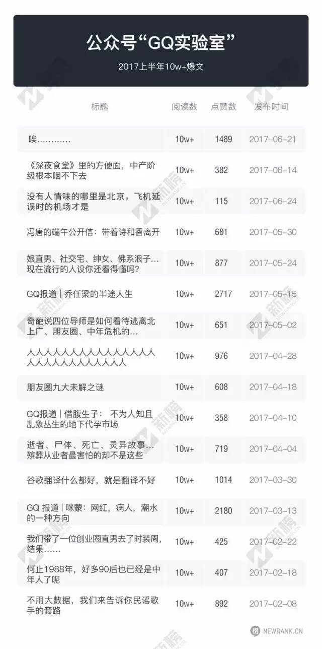据新榜统计,整个2016年,由GQ新媒体原创的10w+只有1篇,但进入2017年,「GQ实验室」仿佛被施了魔法,仅上半年的10w+篇数就达到了17篇(原创的13篇)。