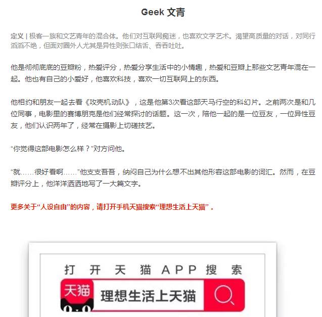 5月24日,「GQ实验室」的头条推送,盘点了当代10个最具代表性的“矛盾人设”,诸如“娘直男”、“社交宅”、“绅女”等有趣的描述,配以准确的人物形象漫画、恰当戳人的文字,让这篇推送最终获得了10w+的阅读,近千的赞。而其实这篇推送是「GQ实验室」为品牌方“天猫App”理想生活节所定制的“原生广告”,虽然只在文章开头和结尾提到了天猫App,但符合活动调性的这样一篇高传播量的推送,还是足够让品牌方满意。以至在9天后,他们又联合天猫推出了「当代人设第二波」,同样斩获近10w+的阅读量。