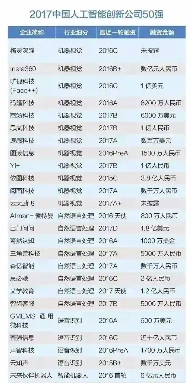 人工智能作为下一个引领式创新的风口机会,越来越受到资本的关注,应用场景不断拓展,近几年国内涌现了一大批优秀的初创公司。2017年,创业邦首次推出了“人工智能创新公司 50 强”这一专项榜单,在历时三个月对 290 家国内人工智能创新公司进行深入调研后,创业邦研究中心评选出了 50 家最优秀的、且在该领域取得技术和商业化突破的新创公司。
