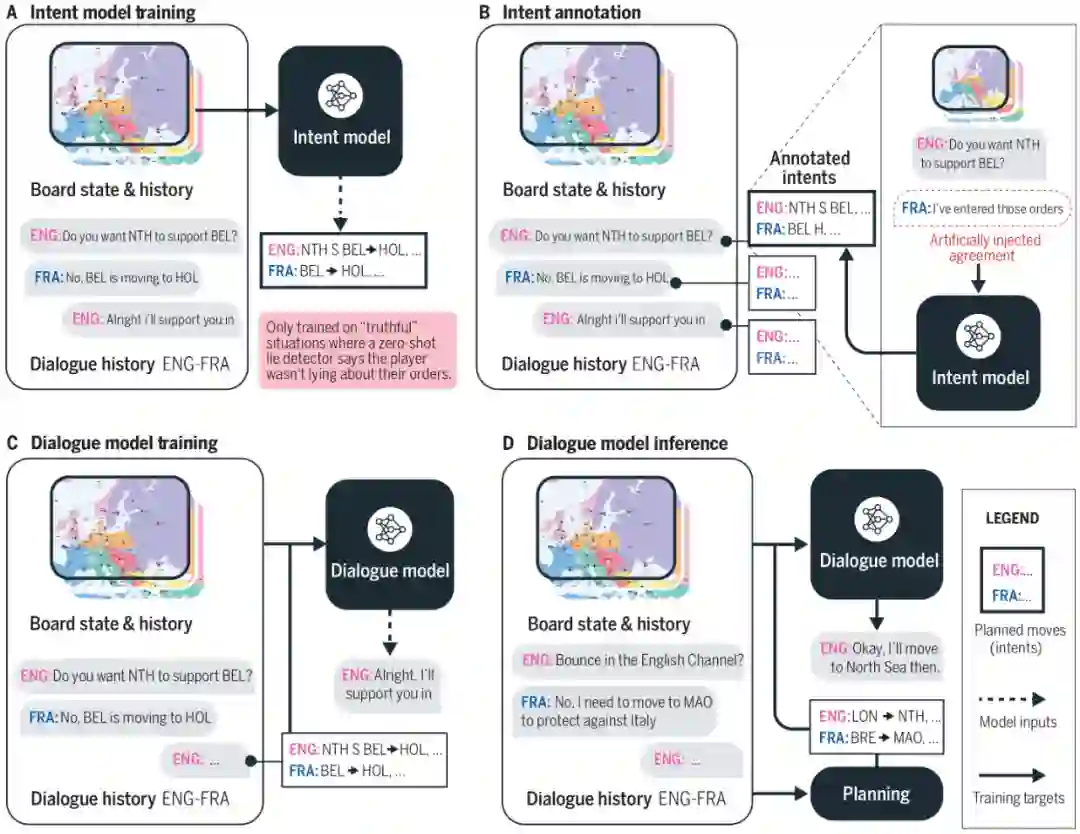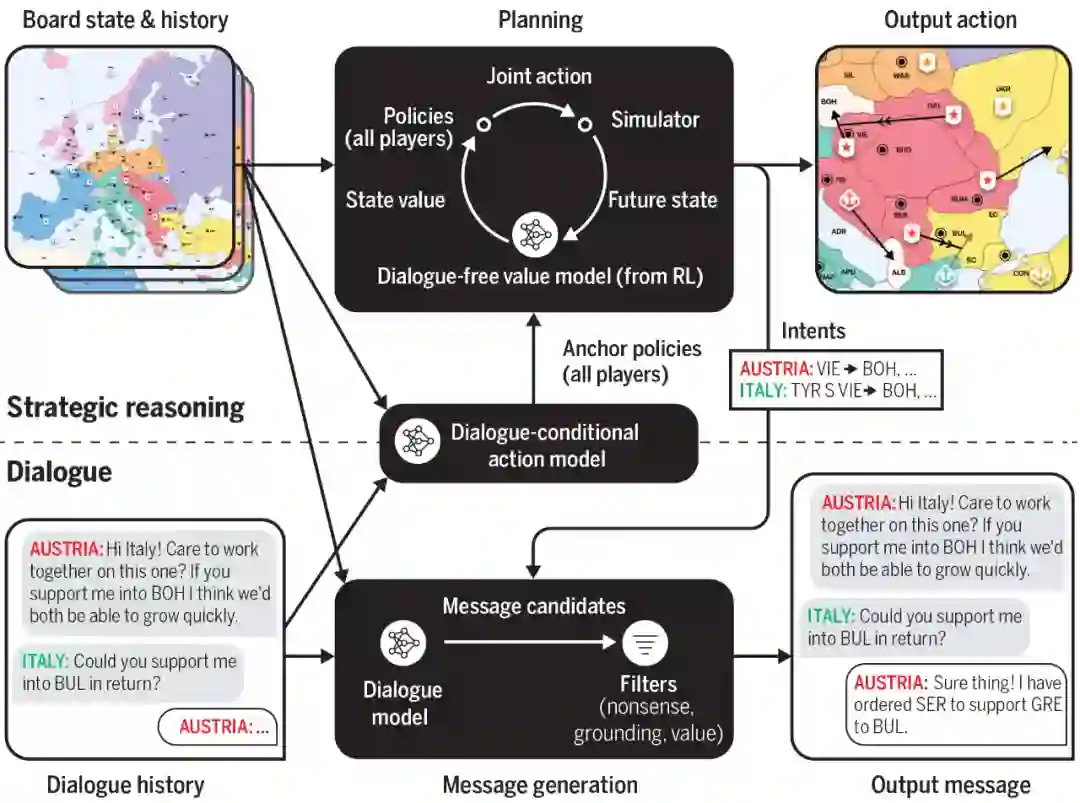 Diplomacy 是一种需要充分交流的复杂游戏,至少近五十年来一直被认为是人工智能面临的重要挑战。要想获胜,参与者不仅要懂策略,还需要结盟、谈判、说服、威胁,偶尔还得学会欺骗。因此,它给 AI 带来的挑战远远超出了下围棋、国际象棋等游戏的系统,或那些在不太复杂环境中进行对话的聊天机器人所面临的挑战。