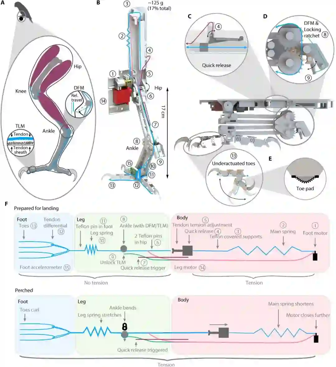 每条腿都分别有用于来回移动和处理抓握的马达。受鸟类脚踝处肌腱走向的启发,SNAG 机械腿采用的类似机制吸收着陆冲击能力并转换为抓握力。因此,SNAG 拥有一个异常强大和高速的离合器,可以在 20 毫秒内触发关闭。一旦机械爪缠绕在树枝上,脚踝处就会锁定,同时右腿上的加速器会报告机器人已经着陆并触发平衡算法来保持稳定。下图为受鸟类启发的抓握设计机制: