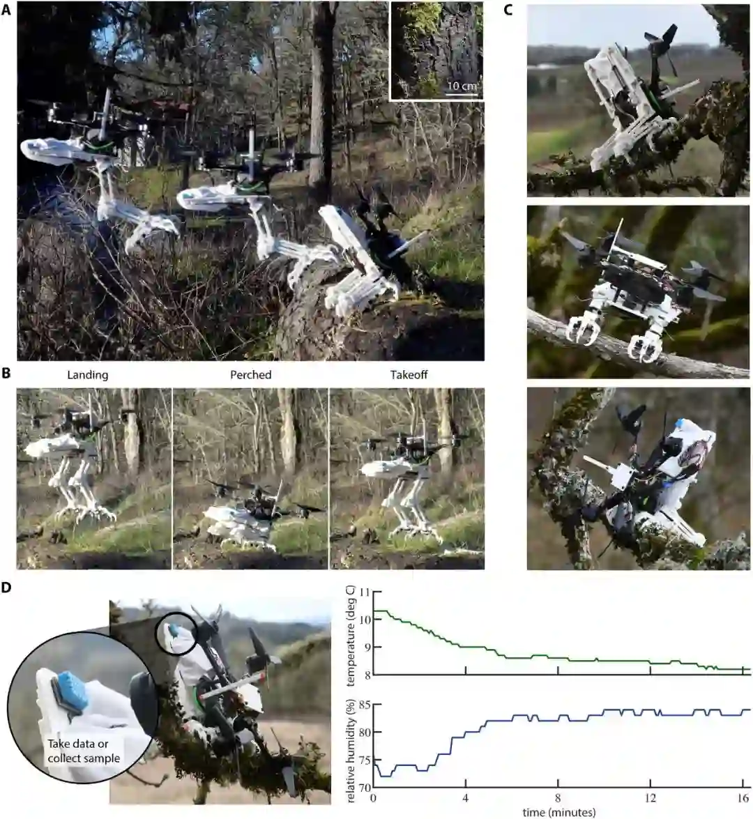 最后,为了验证 SNAG 在真实环境中的稳健性,研究人员在森林中测试了 SNAG 在树枝上着陆和起飞的能力。