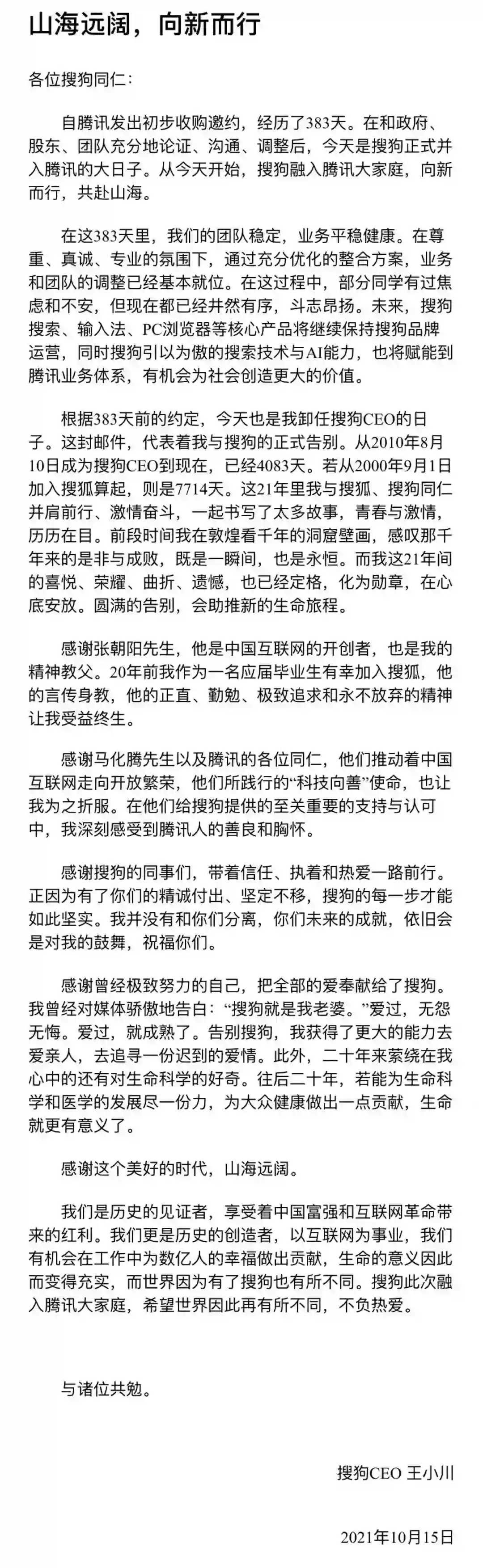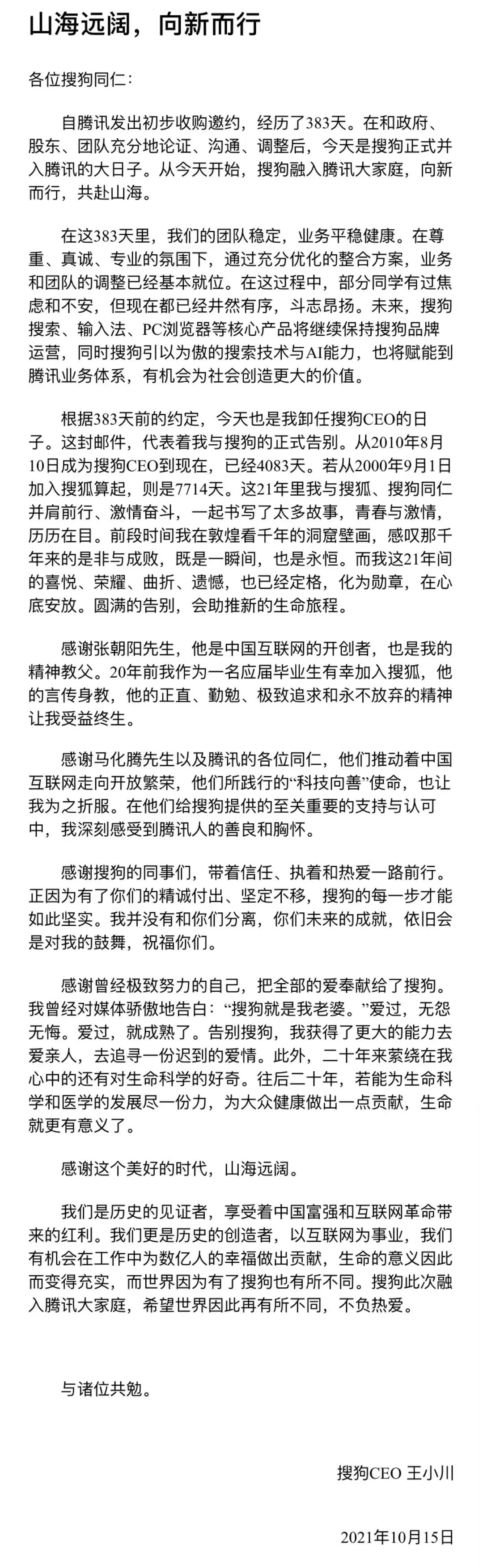 根据383天前的约定,今天也是我卸任搜狗CEO的日子。这封邮件,代表着我与搜狗的正式告别。从2010年8月10日成为搜狗CEO到现在,已经4083天。若从2000年9月1日加入搜狐算起,则是7714天。这21年里我与搜狐、搜狗同仁并肩前行、激情奋斗,一起书写了太多故事,青春与激情,历历在目。前段时间我在敦煌看千年的洞窟壁画,感叹那千年来的是非与成败,既是一瞬间,也是永恒。而我这21年间的喜悦、荣耀、曲折、遗憾,也已经定格,化为勋章,在心底安放。圆满的告别,会助推新的生命旅程。